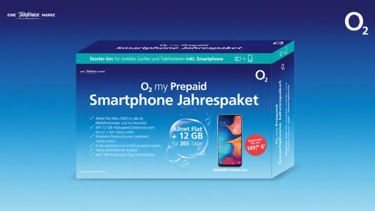 O2 startet ein neues Prepaid-Jahrespaket für O2 Kunden: Das „Alles-drin“-Jahrespaket besteht aus 12 GB Highspeed-Datenvolumen und einer Allnet-Flat für Telefonie und SMS und ist ab dem 24. November erhältlich. Mit dem Smartphone-Jahrespaket können O2 Prepaid-Kunden an 365 Tagen im Jahr für einmalig 69,99 Euro flexibel telefonieren und surfen.1 Es steht direkt nach der Einmalzahlung zur Verfügung. Das Datenvolumen lässt sich bei voller Kostenkontrolle über das gesamte Jahr verteilen. Zwei attraktive Bundles mit dem Samsung Galaxy A20e für nur 149,99 Euro2 oder mit dem Xiaomi Redmi 9A für einmalig 119,99 Euro3 ergänzen das Angebot.